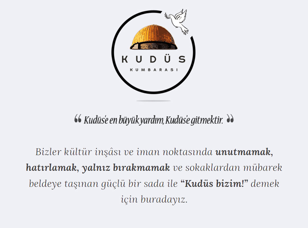 Kudüs Kumbarası projesi, yüreğinde Kudüs hassasiyeti taşıyan gençler ile bu gidişlere vesile olmak isteyenleri bir araya getirmek düsturuyla kurulmuş bir sosyal platformdur.